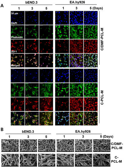 Different growth patterns of ECs on the C/DMF-PCL-M and C-PCL-M. bEND.3 and EA.hy926 ECs (3 × 104) were top-seeded on C/DMF-PCL-M and C-PCL-M and cultured for the indicated periods (n = 4). (A) The growth and morphology of the cells were evaluated via confocal microscopy after cells were stained using DAPI (blue), phalloidin (green), and anti-ZO-1 antibody (red). (B) EC adhesion and morphology on nanofibrous membranes were evaluated via SEM. Data represent four independent experiments.