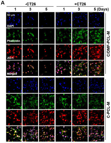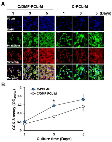 The growth of CT26 cancer cells on C/DMF-PCL-M and C-PCL-M. CT26 cells (3 × 104) were top-seeded on the C/DMF-PCL-M and C-PCL-M and cultured for the indicated periods (n = 3). (A) Cell morphology was evaluated via confocal microscopy after immunofluorescence staining of the cells with DAPI (blue), phalloidin (green), and anti-vimentin antibody (red). (B) Proliferation rates of the CT26 cells were analyzed using the CCK-8 assay. Data represent three independent experiments. * p < 0.05, compared to C/DMF-PCL-M.