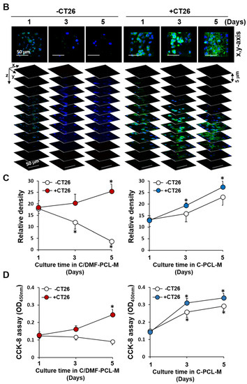 Hypervasculature involvement in metastatic colorectal cancer and hepatocellular carcinoma development was shown earlier [43,44]. We used CT26 murine colon cancer and HepG2 human hepatocellular cancer cells since they secrete VEGF and induce angiogenesis [45,46]. We assessed whether the growth of cancer cells is different on C/DMF-PCL-M and C-PCL-M. The degree of cell distribution increased in both conditions (Figure 3A), however, the proliferation rate was higher on C-PCL-M than on C/DMF-PCL-M (Figure 3B). Thus, in this study, cancer cells were cultured on C-PCL-M and not on C/DMF-PCL-M. In addition, the large pores in the C-PCL-M might facilitate deeper infiltration of cells into the scaffold and help maintain cell aggregates in the scaffold [28].