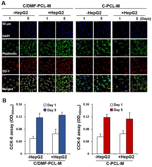 Growth of EA.hy926 ECs co-cultured with HepG2 cancer cells on C/DMF-PCL-M and C-PCL-M in a two-layer culture system. EA.hy926 cells (3 × 104) were top-seeded on either C/DMF-PCL-M or C-PCL-M in the upper layer and cultured with (+HepG2) or without (−HepG2) HepG2 cells (3 × 104) on the C-PCL-M in the lower layer. Cells were cultured for the indicated periods (n = 3). (A) Cells were stained with antibodies and cell distribution and morphology were assessed via confocal microscopy. Images represent three fields in each nanofibrous membrane. (B) Cell proliferation rates were analyzed using the CCK-8 assay. Data are presented as mean ± SD values (n = 3).