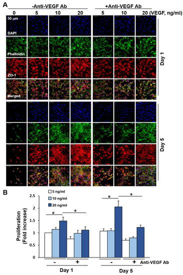 We investigated whether VEGF induces bEND.3 cell growth upon co-culturing with cancer cells because EC growth was significantly decreased without exogenous VEGF and recovered upon co-culturing with cancer cells. bEND.3 cells are known to express VEGF receptor-1 and VEGF receptor-2 [47]. First, experiments were performed with bEND.3 cells cultured on C/DMF-PCL-M with VEGF at different concentrations. As shown in Figure 6A, VEGF increased the distribution of fluorescently labeled cells in a dose-dependent manner for 5 d in culture. The cell proliferation assay revealed an increased proliferation of bEND.3 cells by VEGF (Figure 6B). Moreover, the VEGF-induced increase in EC growth and proliferation was blocked significantly upon treatment with anti-VEGF antibodies. These results suggest that VEGF induced growth and proliferation of bEND.3 cells in a 3D culture condition. In this study, EA.hy926 cell growth was maintained in the 3D culture, whereas the growth of primary human umbilical vein endothelial cells (HUVECs) was not significantly increased in the presence or absence of VEGF (data not shown). Reports show that EA.hy926 cells express both VEGF receptor-1 and VEGF receptor-2 [48,49]. Upon VEGF treatment of Ea.hy926 cells seeded on C/DMF-PCL-M, the cells displayed an elongated morphology and increased growth after short-term treatment. However, the effect of VEGF on EA.hy926 cell growth was less significant after prolonged culturing (Supplementary Figure S2A,B). The formation of tight junctions between adjacent ECs was clearly observed in the 2D culture (Figure 7A), whereas ZO-1 expression was primarily detected throughout the cytoplasm of the ECs cultured in the nanofibrous scaffold. In a focus-stacking analysis of confocal microscopy images of ZO-1 expression, VEGF-treated bEND.3 cells maintained an elongated cell morphology and a few cell-cell junctions were observed in C/DMF-PCL-M (Figure 7B). In addition, the growth and tight junction formation of bEND.3 ECs cultured in C-PCL-M were not significantly increased by VEGF treatment. Patterns of ZO-1 expression were similar to that of bEND.3 cells in EA.hy926 ECs cultured in culture plates and PCL-M (Supplementary Figure S3A,B). The lower formation of tight junctions in the porous nanofibrous scaffold than on the 2D culture plates may be due to the adhesion and growth of ECs along nanofibers rather than the formation of tight junctions on flat surfaces.