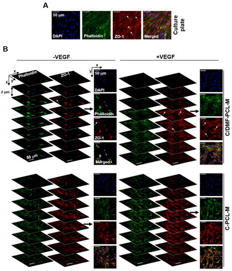 ZO-1 expression in bEND.3 ECs cultured on a culture plate and nanofibrous membrane scaffold. bEND.3 ECs (3 × 104) were cultured for 5 d on a culture plate (A) and C/DMF-PCL-M or C-PCL-M in the presence (+VEGF) or absence (−VEGF) of VEGF (B) (n = 3). The formation of tight junctions between the cells (arrows) was evaluated using confocal microscopy after the cells were stained using anti-ZO-1 antibody (red). In panel B, the localization of tight functions was evaluated by focus-stacking images of ZO-1 expression in the cells. The data represent three independent experiments.