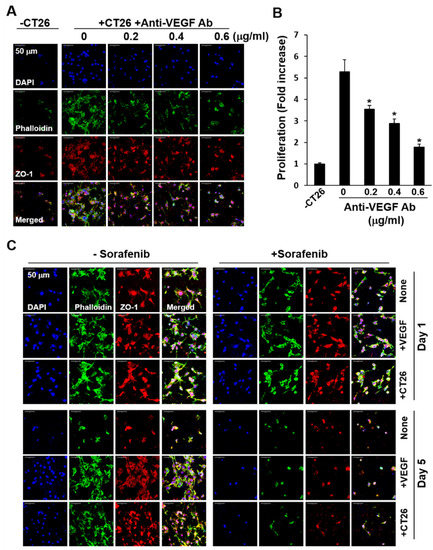 Inhibition of co-culture-induced growth of bEND.3 ECs by anti-VEGF antibody and sorafenib in a two-layer system. bEND.3 and CT26 cells (3 × 104) were co-cultured in a two-layer system with anti-VEGF antibody at increasing concentrations for 5 d (n = 3). (A) bEND.3 cells on C/DMF-PCL-M in the upper layer were stained with DAPI, phalloidin, and anti-ZO-1 antibodies. Cell morphology was analyzed via confocal microscopy. (B) The proliferation of bEND.3 cells was assessed using the CCK-8 assay and presented as a fold increase. (C) bEND.3 cells were cultured alone (None), cultured with VEGF (+VEGF), and co-cultured with CT26 cells (+CT26) in the presence (+Sorafenib) or absence (−Sorafenib) of sorafenib (1 μM) for 1 d and 5 d (n = 3). Images represent three independent experiments. Data are presented as mean ± SD values (n = 3). * p < 0.05, compared to cultures without anti-VEGF Ab.