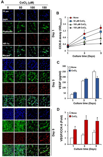 Decreased proliferation of CT26 cancer cells cultured on C-PCL-M and treated with CoCl2 at high concentrations. CT26 cells (3 × 104) alone were top-seeded on C-PCL-M and cultured for the indicated periods with CoCl2 at increasing concentrations (n = 3). (A) Cells were stained with DAPI, phalloidin (green), and anti-HIF-1α antibodies (red). Cell distributions and fluorescence intensities were analyzed via confocal microscopy. (B) Proliferation rates of the cells were analyzed via the CCK-8 assay. (C) CT26 cell were treated with 150 μM CoCl2 and VEGF concentrations in the conditioned media were measured via ELISA. (D) CT26 cells were treated as in the panel C and mean VEGF concentrations (n = 3) were compared to mean CCK-8 levels (n = 3). Images represent three independent experiments. Data are presented as mean ± SD values (n = 3). * p < 0.05, compare to cultures without CoCl2.