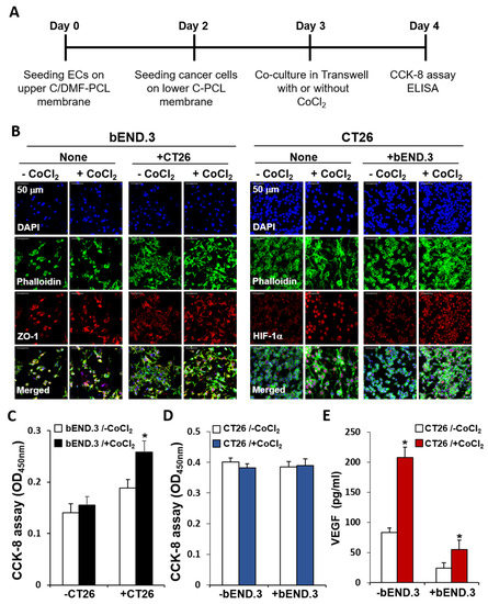 We investigated the effects of hypoxia on EC growth in the co-culture. Decreased growth of bEND.3 cells after prolonged culturing was reversed upon co-culturing with cancer cells, however, EC growth was not further increased upon CoCl2 treatment in the co-culture. Furthermore, treatment of co-cultures with CoCl2 did not increase VEGF secretion from cultured CT26 cells. Thus, as shown in Figure 10A, the effects of CoCl2 on the growth of bEND.3 and CT26 cells were assessed in a state of restrained growth of ECs under modified co-culture conditions. bEND.3 cells were cultured on C/DMF-PCL-M for 2 d and CT26 cells were cultured on C-PCL-M cultured for 4 h for membrane adherence in each well. These two cell-membrane constructs were assembled as a two-layer system in the Transwell chambers and ECs and cancer cells were co-cultured in the presence or absence of CoCl2 (150 μM) for another 1 d. When bEND.3 cells were treated with CoCl2 in the presence of CT26 cells, the growth of bEND.3 cells was more prominent upon confocal microscopic analysis of the distribution and densities of labeled cells on the upper C/DMF-PCL-M (Figure 10B). After 1 d of treatment with CoCl2, the numbers of fluorescently labeled CT26 cells did not decrease, although HIF-1α upregulation was observed in CoCl2-treated CT26 cancer cells rather than in untreated cells. The CCK-8 assay in the upper layer containing ECs revealed a significant increase in the number of live bEND.3 cells upon co-culturing with CT26 cells and further increased upon addition of CoCl2 to the co-culture (Figure 10C). In comparison, the number of live CT26 cancer cells did not significantly decrease upon addition of CoCl2 to monoculture of CT26 cells and co-culture and did not increase upon co-culturing with bEND.3 cells, when compared to the monoculture of cancer cells (Figure 10D). Finally, we assessed VEGF secretion via ELISA. As shown in Figure 10E, the concentrations of VEGF secreted from CoCl2-treated CT26 cells for 1 d were significantly higher than those from untreated cells. VEGF concentrations were lower in co-cultures of CT26 and bEND.3 cells than in monoculture of CT26 cells. These lower VEGF levels in the media of co-cultures may result from the binding of secreted VEGF to cell membrane receptors in ECs. Together, the present results indicate that chemically induced hypoxia increased VEGF production in cancer cells and enhanced the growth of ECs in the nanofiber-based two-layer co-culture system.