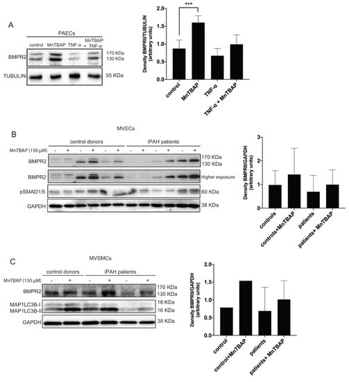 2.2. MnTBAP Increases the Levels of BMPR2 in Pulmonary MVECs and MVSMCs Isolated from iPAH Patients