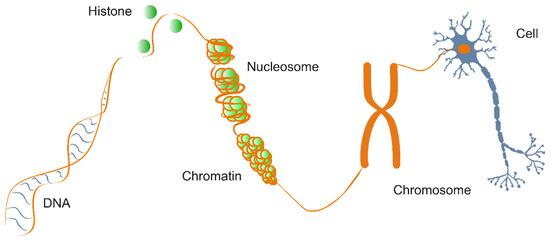 To capture the epigenetic mechanisms of developmental biology it is necessary to unravel how the genetic program unfolds or is modified in the case of diseases at the level of nucleosomes. This goal can be achieved by the development of structure–activity relationships based on intermolecular interactions of bio-macromolecules directing cell cycle, transcription, translation and cellular signaling pathways [14,15,16]. In this sense, precise understanding of epigenetic regulation requires atomic level determination of interactions in nucleosomes between histone proteins and DNA [17,18], readers, and writers affecting gene expression in the brain [19]. Figure 1 sketches the afore-mentioned levels of epigenetic regulation. With this molecular background in mind, epigenetics can be also considered as “the structural adaptation of chromosomal regions so as to register, signal or perpetuate altered activity states” [20].