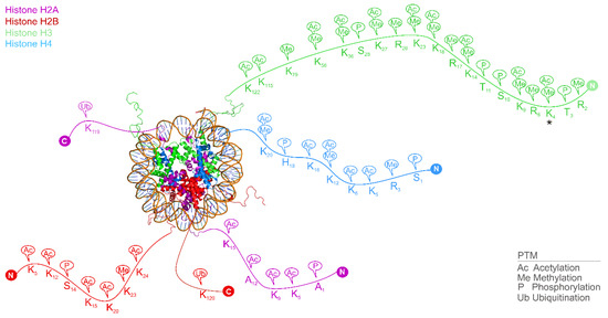 The three-dimensional structure of a nucleosome combined with a schematic representation of post-translational modifications (PTMs) on the histone tails assembled from recent articles [31,36,37,38,39,40,41,42,43,44,45,46]. The nucleosome structure was rendered in top view by PyMol [47] using PDB structure 1kx5 [48]. Histone proteins are shown in cartoon representation as wrapped by the DNA double helix. The N- and C-terminal tails of histone proteins pass through the cylinder of the supercoiled DNA and are available for reader proteins recognizing the PTMs, key components of the histone code system.