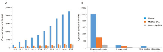 To satisfy the above-mentioned need for establishing new SARs, numerous biomolecular structures of epigenetic importance have recently been deposited in the PDB. A quick search of the PDB results in more than four thousand entries, and more than half of these entries were deposited in the past decade. The corresponding statistics are presented in Figure 3 with a general overview of the trends of experimental structure determination in the epigenome. The statistics are based on the counts of PDB structures relevant to Categories i–iii in Section 1. In general, X-ray crystallography is the oldest and most wide-spread technique, and it has a leading role (Figure 3A) in the determination of structures of the epigenome, as well. If considering the types of biomacromolecules, histone-containing structures form the most abundant group. The number of such entries shows a dynamic increase (Figure 3B) in the past ten years. This trend reflects the growing efforts on solving the “histone code” and exploration of the effects of PTMs (Category ii in Section 1).