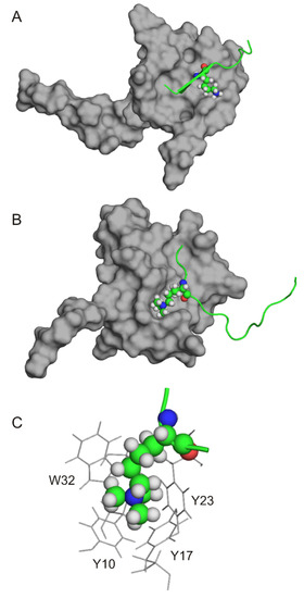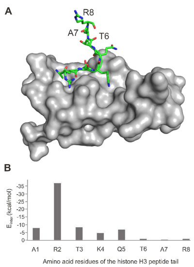 The histone H3–autoimmune regulator protein (AIRE) complex is a representative example of the above-mentioned situation. Most of the interactions take place between the first five amino acids of the N-terminal tail of the histone hampering the determination of the rest of the histone tail either experimentally or theoretically [99]. Histone recognition by a bromo-, homeo-, chromodomains or transcription factors involves only a shallow depression of the protein surface [91,96,97,98]. These flat binding surfaces often result in low interaction energies at most of the binding residues. As another example, the complex of the UHRF (see also Section 2.1.1) protein PHD finger and histone H3 N-terminal peptide tail is featured in Figure 5. The atomic resolution structure ([120], Figure 5A) and the corresponding [99] distribution of per-residue interaction energy values (Einter, Figure 5B) show that starting from the sixth amino acid, physical interactions tend to cease. This is a challenging situation in the investigation of histone tail binding to reader proteins both experimentally and theoretically. From an experimental perspective, the non-interacting part of the histone peptide tail moves dynamically in the bulk solvent, and it is hard to capture. On the other hand, fast computational docking approaches try to find the bound peptide position with the best possible interaction energy, creating non-existent interactions (mis-docked conformations, see also Section 3).