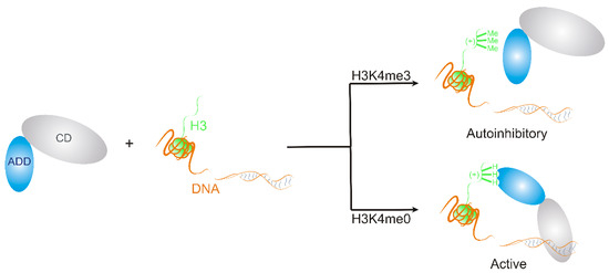 A schematic representation of the effect of H3K4me3 trimethylation on DNMT3A enzyme activity. In the presence of H3K4me3 PTM, the DNMT3A enzyme is in an autoinhibitory form. In the case of the non-methylated H3K4me0, the enzyme interacts with the DNA in an active form where the arrangements of its ADD and CD domains is different from that in the autoinhibitory form.