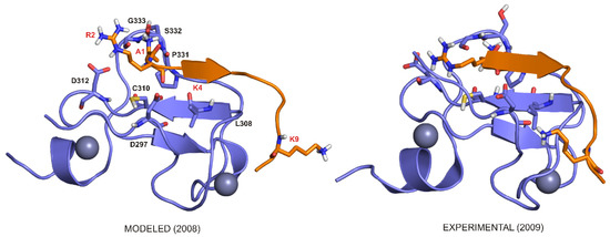 For example, in a recent study of Wagner et al. [94] the whole triad of the DNA–histone–reader complex was solved using cryo-electron microscopy (Figure 4). The structure contains the switch/sucrose non fermentable (SWI/SNF) chromatin structure remodeling complex with a subunit called nuclear protein STH1/NPS1, which is multi-functional as a histone H4 reader, as well. The interaction of the nucleosome core histone octamer, the DNA double helix wrapped around it, the protruding histone H4 tail and the reader protein are all visible, providing indispensable details for the development of SARs. The first electron microscopic map supplied the whole complex at a 15 Å resolution, and further refinements were possible for the nucleosome. Parts of the whole complex were also rigid body fitted from other PDB structures, which included both X-ray crystallographic and cryo-EM structures. This study [94] applies complementary experimental and theoretical methods such as map alignment, rigid body fitting, homology modeling and real space refinement with secondary structure restraints to solve the complex of more than one thousand kDa molecular weight.