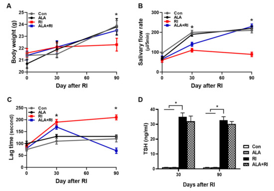 Changes of mouse body weights, salivary flow rate, and lag times after radioiodine (RI) exposure. Mice were subjected to radioiodine (RI, 0.01 mCi/g body weight orally). ALA was administered 24 h 30 min before RI exposure (100 mg/kg body weight, i.p.). (A) Body weight, (B) salivary flow rate, and (C) saliva lag time were measured at each time points after RI exposure. Scoring of salivary flow rate and lag time is described in the “Materials and Methods” section (B, C) The ALA-treated group showed improved lag time and increased saliva secretion relative to the RI only group. (D) To verify the effects of ALA on thyroid function following RI therapy, ELISAs for serum TSH were performed (both 30 and 90 days). The serum TSH levels were significantly increased in RI only group and tend to decrease by ALA treatment but not significant. The Kruskal–Wallis test followed by post hoc testing with Dunn’s test was used to examine differences between groups. In all analyses, * P < 0.05 was taken to indicate statistical significance.