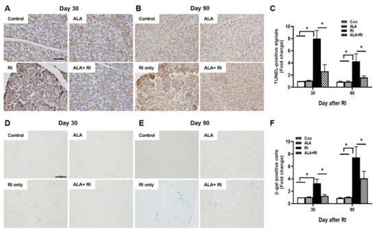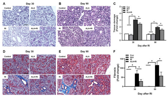 Histological changes were identified by hematoxylin and eosin (HE) and Masson trichrome (MT) staining at 30 and 90 days post-RI therapy. The control group showed well-demarcated lobules with dense acini and fully developed ducts. At both 30 and 90 days post-RI, the RI only group exhibited multifocal areas of cytoplasmic vacuolization. The ALA + RI group had intact structures similar to the control group (Figure 2A–C). Diffuse fibrotic tissues were observed in the RI only group at both 30 and 90 days post-RI (Figure 2D,E). The signal for fibrosis was stronger at 90 days than at 30 days. The ALA + RI group showed less perivascular and periductal fibrosis than the RI only group (Figure 2D–F).