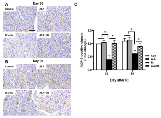 Aquaporin 5 (AQP-5) expression in the SGs of mice that underwent RI therapy. Tissues were dissected from each mouse, fixed in 4% paraformaldehyde, and cut into sections 5 μm thick. Diaminobenzidine (DAB) staining (brown) of AQP-5 to identify salivary function. Representative sections immunohistochemically stained for AQP-5 expression in the acinar cells of the control and ALA only groups. AQP-5 expression level was significantly higher in the RI + ALA group than the RI only group. (A,C) 30 days post-RI therapy; (B,C) 90 days post-RI therapy. Data are means ± SD. * P < 0.05 compared to the indicated groups. Scale bars: 100 μm.