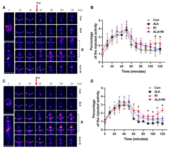 Planar whole-body images and dynamics of 99mTc pertechnetate uptake and excretion. (A,C) Representative single-photon emission computed tomography (SPECT)-scans of mice that underwent RI therapy. (B,D) The rates of 99mTc pertechnetate uptake were similar among all mice both 30 and 90 days after therapy. The level of excretion was significantly lower in the RI only group than the RI + ALA group, and the differences in excretion were greater at 90 days than at 30 days. (A,B) 30 days post-RI therapy; (C,D) 90 days post-RI therapy. Data are means ± SD. * P < 0.05 compared to the RI only and RI + ALA groups. The drug is pilocarpine.