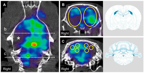 Single photon emission computed tomography (SPECT)/computed tomography (CT) images and regions of interest (ROI) settings to evaluate cerebral and cerebellar blood flow after MCAO. SPECT acquisitions were color-coded with National Institute of Health spectrum color scale. (A), Vertical section of SPECT/CT image obtained 2 days after middle cerebral artery occlusion (MCAO) shows obvious hypointensity at the right middle cerebral artery territory (*). Dashed line “b” indicates the coronal slice 2 mm posterior from bregma and dashed line “c” indicates the coronal slice 11 mm posterior from bregma. (B) In the coronal slice 2 mm posterior from bregma, 6 × 9 × 6 mm 3D-elliptical ROIs were symmetrically placed. (C) In the coronal slice 11 mm posterior from bregma, 2 × 2 × 2 mm global ROIs were symmetrically placed at medial cerebellar cortex, lateral cerebellar cortex and cerebellar nuclei of each side respectively.