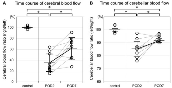 (A) Rats in the control group showed no apparent laterality of cerebral blood flow. Cerebral blood flow ratio (right/left) was significantly decreased two and seven days after MCAO. The plots of each individual are connected with bottled lines. This ratio significantly recuperated over time. (B) Rats in the control group showed no apparent laterality of cerebellar blood flow. Cerebellar blood flow ratio (left/right) was significantly decreased two and seven days after MCAO, but this decrease was of a lesser degree than that in the cerebrum. As in the cerebrum, the decrease in blood flow ratio in the cerebellum likewise recuperated over time. (* p < 0.05, n = 5 in the control group, n = 8 in the MCAO group).