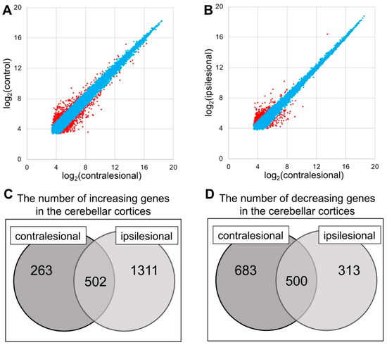 (A,B) Correlation plot of the contralesional, ipsilesional and control group. The genes with expression change between two conditions <2.0× are labeled as blue and ≥2.0× as red. (C,D) The mRNA gene expression ratio was expressed as the ratio of the fluorescence intensity of the contra-or ipsilesional group to that of the control group. Increasing genes were defined as those for which Log2 (ratio) > 1 if the ratio was more than double, while decreasing genes were defined as those for which Log2 (ratio) < −1 if the ratio was less than one-half.