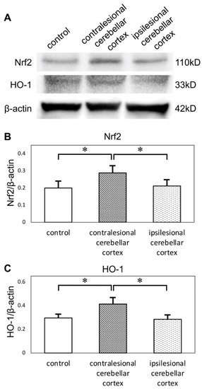 (A) Western blots of cerebellar cortices show expression of Nrf2 and HO-1. Protein levels were normalized to beta-actin. (B) Quantification of western blots by densitometric analysis indicated that the expression of Nrf2 was upregulated in contralesional cerebellar cortices. (C) The expression of HO-1 was also upregulated in contralesional cerebellar cortices (* p < 0.05 versus other groups, n = 6 in each group). Nrf2: nuclear factor erythroid 2-related factor 2, HO-1: heme oxygenase-1.