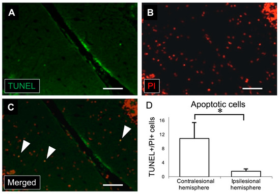 (A) Immunostaining for TUNEL (green) shows apoptotic cells in the molecular layer of the cerebellar cortex. (B) Nuclei were stained with PI in red. (C) Merged image of TUNEL and PI immunostaining. White arrowheads indicate TUNEL/PI-positive cells. (D) There was a significant increase in the number of TUNEL/PI-positive cells in the contralesional (left) cerebellar cortex compared to the ipsilesional (right) cerebellar cortex (scale bar: 50 μm, * p < 0.001, n = 11 in each group). TUNEL: terminal deoxynucleotidyl transferase deoxyuridine triphosphate nick-end labeling, PI: propidium iodide.