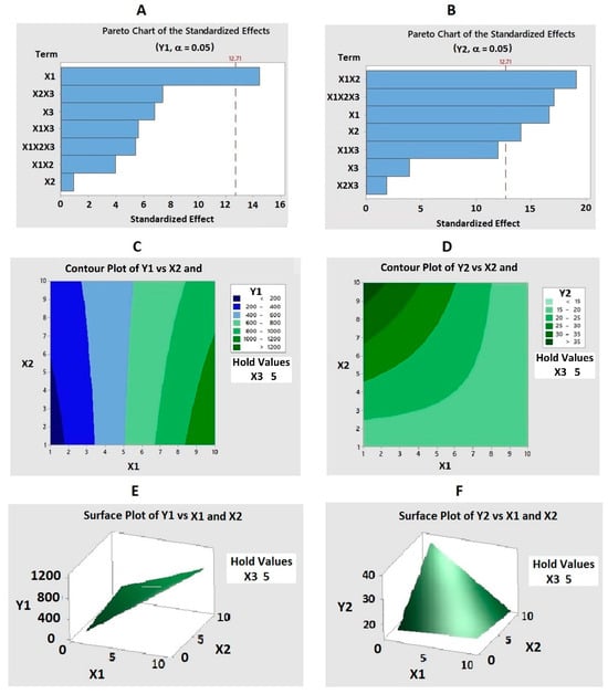 Pareto charts (A,B) showing the vertical dashed reference line of significance (p < 0.05). Contour plots (C,D) and three-dimensional (3D) response surface plots (E,F) for Y1 and Y2, showing the effects of X1, X2, and X3, as well as their combined effects on Y1 and Y2. Abbreviations: X1, FLV concentration (mM); X2, TAT concentration (mM); X3, pH of the medium Y1, particle size (nm); Y2, zeta potential (mV); the interaction term between the factors X1X1, X2X2, and X3X3 are the quadratic terms between the factors; X1X2, X1X3, X2X3, and X1X2X3 are the interaction terms of the investigated factors.
