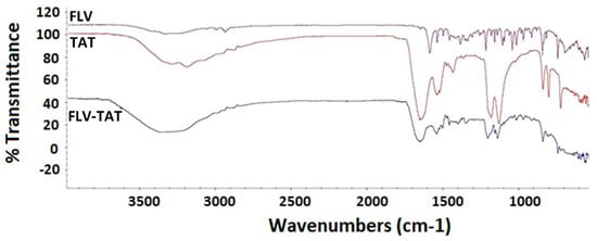 FLV showed a broadband peak at 3100–3500 cm−1 due to alcoholic and carboxylic hydroxyl groups (Figure 2). TAT showed a strong broadband at 3300–3400 cm−1 of NH stretching related to NH2, amide, and guanidine groups, which are associated with a strong peak around 1500–1700 cm−1, as well as broadbands related to NH bending at 1580–1650 cm−1, amidic C=O stretching at 1680 cm−1, and C=N stretching of guanidine at 1690 cm−1. FLV-TAT showed a very broadband extended at 3000–3700 cm−1; also, characteristic bands at 1500–1700 cm−1 of TAT were sharply reduced in intensity in FLV-TAT, confirming the interaction of the main function groups of FLV and TAT together like a complex formation (Figure 2).