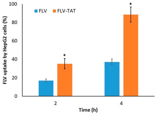 Percentage cellular uptake of FLV after 2 and 4 h for raw FLV and optimized FLV–TAT. Data represent mean of six independent replicates ± SD. * Significantly different (p < 0.05) relative to corresponding FLV, as determined by Student’s t-test.