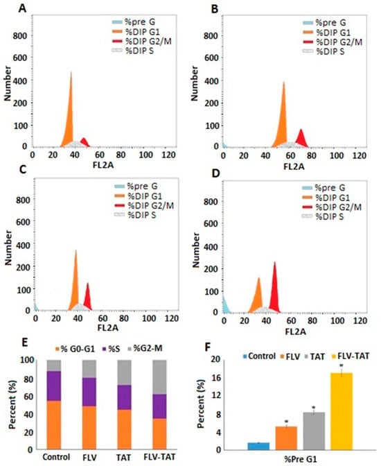 As given in Figure 5A, control HepG2 cells exhibited proliferative properties, with 54% ± 3.8 % at the G0/G1 phase, 33% ± 2% at the S phase, 12.6% ± 1.2% at the G2-M phase, and only 1.36% ± 0.02% at pre-G1 phase. Incubation in FLV (0.1 µM), TAT (1 µM), and FLV–TAT (0.1 µM–1 µM, respectively) slowed the proliferation of HepG2 cells and induced their accumulation at the pre-G1 apoptotic phase (Figure 5B–D). This accumulation amounted to 7.26% ± 0.9%, 8.36% ± 0.5% and 16.12% ± 1% for FLV, TAT, and FLV–TAT, respectively. In addition, FLV–TAT-treated cells showed significant accumulation in G2-M phase. Different cell cycle stages are compared in Figure 5E,F.
