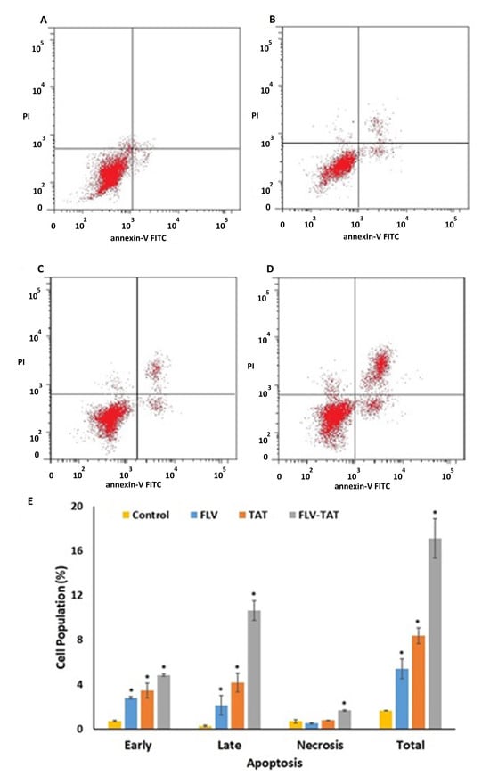 To confirm the observed apoptosis, an annexin V test was carried out, and the percentage of HepG2 cells that stained positive was calculated for the control, FLV, TAT, and FLV–TAT groups (Figure 6A–D). It is apparent that FLV–TAT had an obvious increase in early, late, and total cell death relative to the other studied groups. Figure 6E shows different types of cell death.