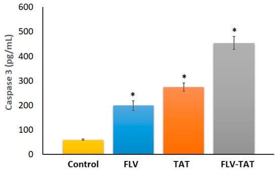 Assessment of caspase 3 concentration in HepG2 cells indicates a significantly higher concentration of the enzyme in FLV–TAT compared with raw FLV, TAT, and control groups. Caspase 3 concentration was found to be 198.6 ± 19.9, 273.9 ± 17.1, 454.2 ± 26.7 pg/mL for FLV, TAT, and FLV–TAT, respectively, as shown in Figure 7.
