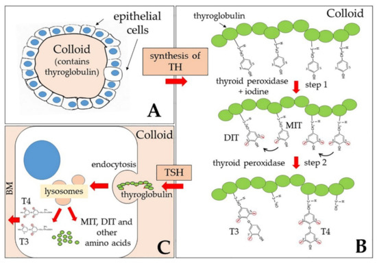 From time to time, as a response to the thyroid-stimulating hormone (TSH), endocytosis (both macro- and micropinocytosis) of thyroglobulin from the apical surface of thyrocytes that line the follicle and fusion of endosomes with lysosomes allow digestion of thyroglobulin by proteases and release of the hormones, as well as of other amino acids, including MIT and DIT (Figure 1). Thyroglobulin thus functions both as a precursor for TH synthesis and as a storage of inactive hormones in the lumen of follicles.