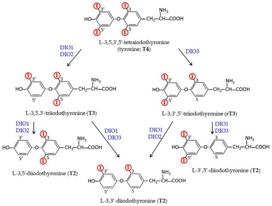 - Bianco, A.C.; Salvatore, D.; Gereben, B.; Berry, M.J.; Larsen, P.R. Biochemistry, cellular and molecular biology and physiological roles of the iodothyronine selenodeiodinases. Endocr. Rev. 2002, 23, 38–89. [Google Scholar] [CrossRef] [PubMed]