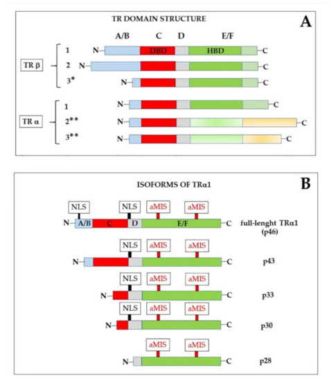 (A): Schematic drawing of the domain structure of thyroid hormone nuclear receptors (TRs). Each isoform contains: (1) An N-terminal A/B domain, of variable length, (2) a highly conserved DNA-binding domain (DBD, or C domain), (3) a hinge D domain, (4) the hormone-binding domain (HBD or E domain), and, finally, (5) a C-terminal domain (F domain). * This isoform was only found in rat [77,89]. ** These isoforms are not able to bind hormones [12,77]. (B) The mature mRNA encoding TRα1 can give rise to different isoforms, depending on the AUG from which translation begins. The truncated isoforms are shorter at the N-end, but have an unaltered hormone-binding domain. NLS, nuclear localization signal; MIS, atypical mitochondrial import sequences (MIS), that mediate import of p43 and p28 to the mitochondrial matrix and the inner mitochondrial membrane, respectively [14,18] (discussed in Section 3.3).
