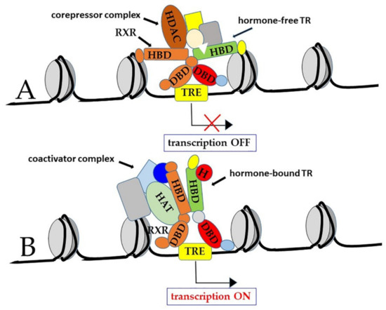 In more detail, when TRs are bound to ‘positive’ TREs in the hormone-free form, they are part of co-repressor complexes that include the nuclear corepressor (NCoR), the silencing mediator for RXR and TR (SMRT), and histone deacetylases (HDAC). These latter enzymes also associate with methyl-CpG-binding proteins, thus contributing to methylation-dependent gene silencing [12,37,95].