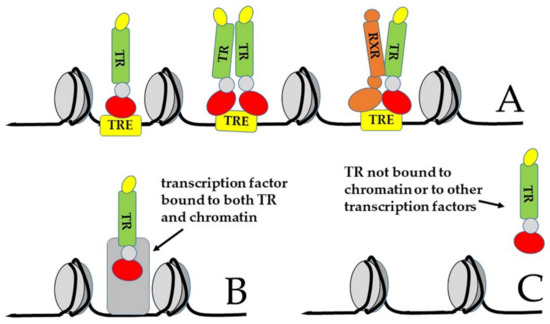 Possible alternative ways of action of TRs. (A) Canonical way of action: TRs can interact with DNA elements called thyroid hormone responsive elements (TRE) as monomers, as homodimers, or as heterodimers with RXR; (B) TRs can interact with chromatin in an indirect way, by tethering to another chromatin-bound protein; (C) the action of TR can be independent of both direct and indirect chromatin binding [16].