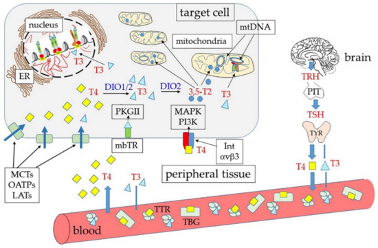 Thyroid hormones (THs) are among the regulatory factors with the highest number of effects in the human body. They do so through different mechanisms, the best understood of which rely on their ability to bind nuclear receptors [1,10,11,12,13,14]. As discussed below, in the absence of active hormone, the receptors associate with co-repressors and inhibit chromatin transcription, while, upon binding with THs, they release co-repressors, bind co-activators, and stimulate transcription of those genes they had inhibited before [15]. The real situation is actually more complex because some nuclear receptor-mediated TH effects do not involve a direct binding of receptors to DNA [16]. In addition, some rapid TH effects are mediated by hormone binding to plasma membrane sites, such as αvβ3 integrin [17], or to other cytoplasmic sites [14,18]. Finally, some catabolic products, once considered inactive, such as 3,5-diodothyronine (3,5-T2), have been more recently found to have important effects in the organism [19,20].