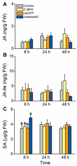 2.4. Herbivory by Nlug-desatA2-Knockdown BPH Increases the Level of SA in Rice
