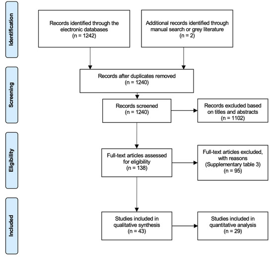Initial screening of electronic databases yielded a total of 1242 articles, and manual search identified 2 publications. After elimination of duplicated studies, 1240 titles and abstract were further evaluated. The screening of titles and abstracts resulted in 138 potentially relevant articles to be selected. The full text of the relevant studies was obtained and thoroughly evaluated. Next, 95 investigations were excluded due to the lack of inclusion of miRNA expression, no data on fold changes, no control group, or appropriate model as indicated in Table S3. Overall, 43 (32 human and 11 animal) studies fulfilled the inclusion and exclusion criteria and were assessed in this systematic review and meta-analysis (Figure 1).