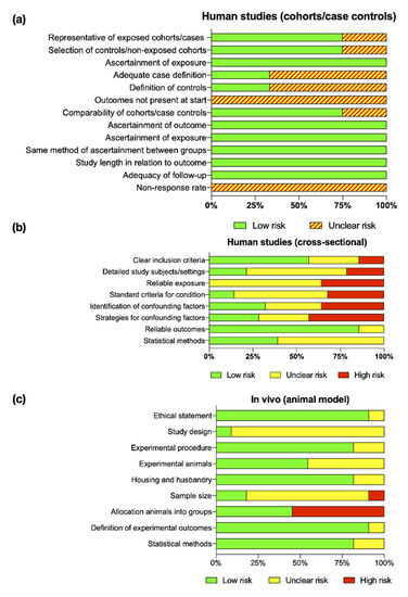 Assessment of quality and risk of bias of the included human nonrandomized cohorts/case–control (a), human cross-sectional (b), and in vivo (animal) (c) studies.
