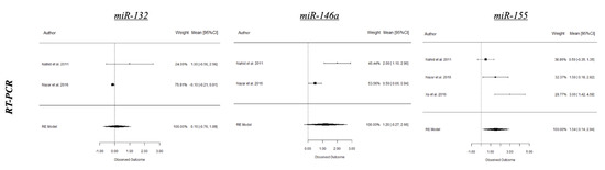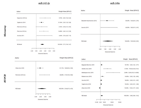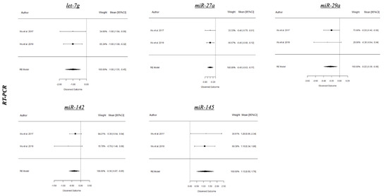 Using a random effect model, a meta-analysis was considered to establish a statistically significant difference (p-values = <0.05*, <0.01**, and <0.001***) among studies reporting fold changes in miRNA expression. The DerSimonian–Liard approach was used to estimate studies variances with confidence interval (IC) of 95% and estimations were depicted using forest plots. Study heterogeneity was calculated with I2 and Cochran’s Q statistics, whereas publication bias was analyzed with Egger’s test and funnel plots using R 3.5.1 [65].