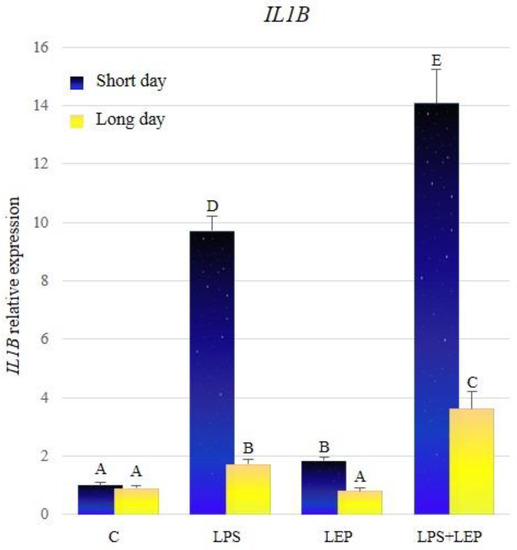 Comparing the relative expression of the IL1B in control groups between different seasons, there was no significant difference stated (Figure 1, Table 1). Groups treated with lipopolysaccharide (LPS) showed a significant increase in the IL1B expression during both photoperiods, in relation to the corresponding control groups. The expression of the examined gene was significantly increased in the group treated with leptin, in comparison to the control group, but only during the short-day photoperiod. The leptin injection after prior LPS treatment caused higher IL1B gene expression, in comparison to groups treated only with LPS or LEP, regardless of the examined season. Moreover, the synergistic effect of both factors was revealed during both seasons. Comparing the IL1B expression between seasons, the gene expression increased much more significantly in the research groups during the short-day photoperiod.