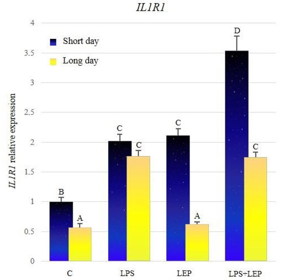 The significantly higher expression of IL1R1 was stated in the control group from the short-day photoperiod, compared to the long-day photoperiod control group (Figure 2, Table 2). The LPS treatment significantly increased the examined gene’s expression compared to the corresponding control group during both photoperiods. Leptin injection stimulated the expression of IL1R1 only during the short-day photoperiod, and the gene expression reached the level of groups stimulated with the LPS. In the short-day photoperiod, the expression of the examined gene in the LPS+LEP group was higher in comparison to the LPS- or leptin-treated group. In the long-day photoperiod, the IL1R1 expression level in the LPS+LEP group did not differ from the one in the LPS-treated group. During both photoperiods, the gene expression in the LPS+LEP groups was increased in comparison to the corresponding control groups; however, only during the short-day photoperiod the effect of the LPS and leptin interaction was synergistic. In long-day photoperiod, the gene expression in the LSP + LEP group did not differ from that of the LPS group.