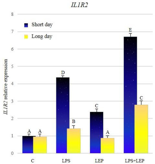 There was no significant difference between control groups from both photoperiods (Figure 3, Table 3). Both groups treated with the LPS showed a significant increase in the expression of IL1R2; however, the expression was significantly higher during the short-day photoperiod. Leptin injection stimulated the expression of the examined gene only during the short-day photoperiod. The synergistic effect of both research factors was observed during both photoperiods; however, the expression of the examined gene was higher during the short-day photoperiod. All research groups, except the controls, showed higher expressions during the short-day photoperiod.