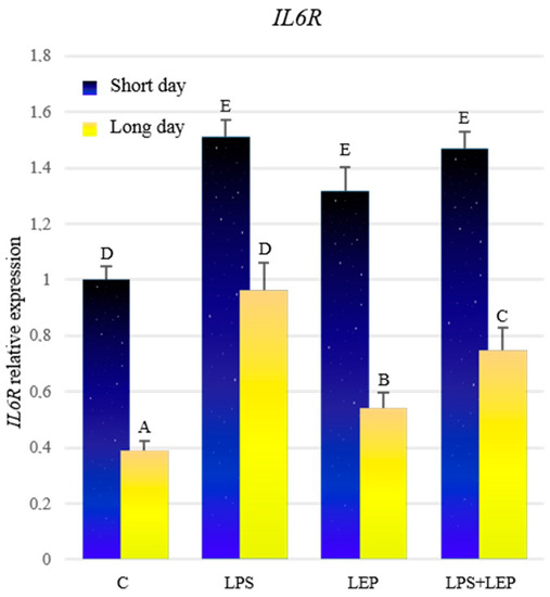Comparing the control groups, the expression of IL6R was significantly higher during the short-day photoperiod (Figure 5, Table 5). Treatment with LPS caused a significant increase in the expression of the examined gene in both photoperiods, in comparison to the corresponding control groups; however, in the short-day photoperiod, this expression was higher. Similarly, after the leptin treatment, the expression increased significantly during both photoperiods, in comparison to the corresponding control groups, but the expression was higher in the short-day photoperiod. Further, in the groups treated with both experimental factors, a significant increase in the expression was stated compared to the corresponding control groups. However, during the short-day photoperiod, the expression in the LPS+LEP group did not differ from that in the LPS- or leptin-treated groups, while during the long-day photoperiod, this expression was lower compared to the LPS group, and higher compared to the leptin-treated group. All groups from the short-day photoperiod showed a higher expression of the IL6R compared to the corresponding long-day photoperiod groups.