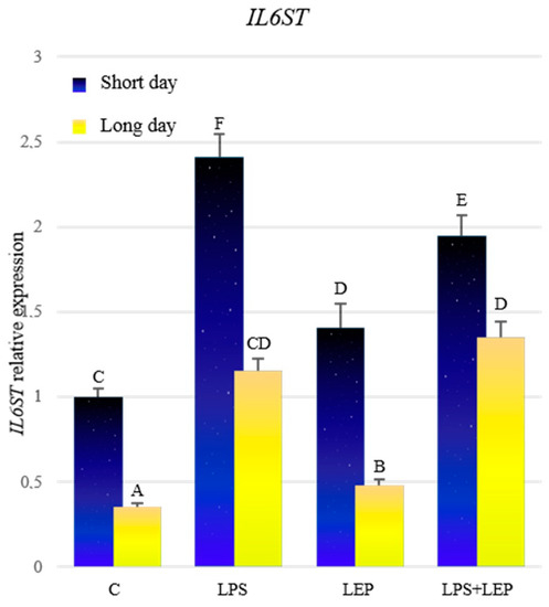 Analyzing control groups, a higher expression of IL6ST during the short-day photoperiod was stated (Figure 6, Table 6). During both photoperiods, treatment with LPS caused an increase in the examined gene’s expression in comparison to the control groups; however, during the short-day photoperiod, the expression was higher. Similarly, the leptin treatment caused the IL6ST expression to increase in both photoperiods, but during the short-day photoperiod, the expression was significantly higher. After the treatment with both experimental factors, the expression of IL6ST increased in both photoperiods, compared to the corresponding control and leptin-treated groups. During the short-day photoperiod, the expression in the LPS+LEP group was lower compared to that in the LPS group, while during the long days it did not differ from the LPS group. During the short-day photoperiod, the antagonistic effect on IL6ST expression of both factors was stated. All groups from the short-day photoperiod showed higher expressions of the examined gene, in comparison to the corresponding groups from the long-day photoperiod.