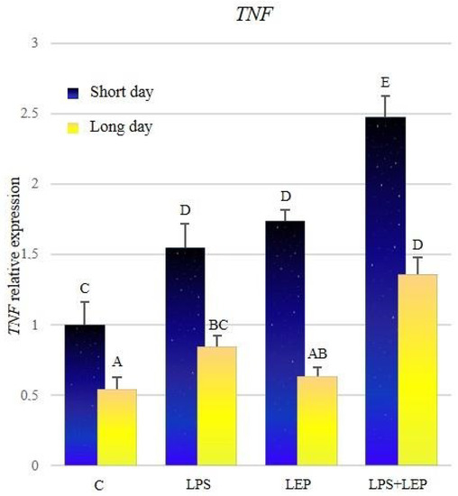 The expression of TNF was significantly higher during the short-day photoperiod in all research groups (Figure 7, Table 7). After the LPS treatment, the expression increased during both photoperiods in comparison to the corresponding control groups. After the leptin treatment, the expression of TNF increased significantly only during the short-day photoperiod; however, during both photoperiods, the expression did not differ from that observed after the LPS treatment. The groups treated with both experimental factors showed a significant increase in TNF expression, in comparison to corresponding groups treated with leptin or LPS alone; moreover, during both photoperiods, the synergistic effect was observed.