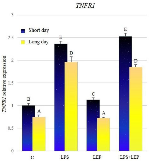 The expression of TNFR1 was significantly higher in all groups from the short-day photoperiod in comparison to corresponding groups from the long-day photoperiod (Figure 8, Table 8). After the LPS treatment, the gene expression increased significantly during both photoperiods, in comparison to the corresponding control groups. Leptin treatment increased the expression of TNFR1 in comparison to the control group only during the short-day photoperiod. Groups that received both experimental factors also showed a significant increase in the expression in comparison to the corresponding control groups; however, during both photoperiods, the expressions did not differ from those observed after the LPS treatment.