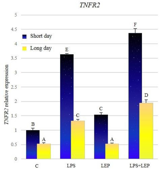 The expression of TNFR2 was significantly higher in groups from the short-day photoperiod, in comparison to corresponding groups from the long-day photoperiod (Figure 9, Table 9). Both groups that received the LPS showed a significant increase in the TNFR2 expression in comparison to the corresponding control groups. Leptin treatment caused an increase of TNFR2 expression only during the short-day photoperiod. Groups that received both experimental factors showed a significant increase in TNFR2 expression compared to the corresponding groups treated with leptin or LPS alone. In both LPS+LEP groups, the synergistic effect was shown.