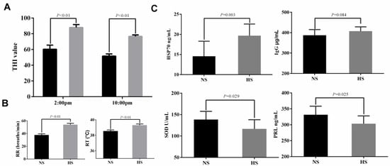 Heat stress-related indicators were identified during the experimental period. (A) changes in the temperature-humidity index at different times; (B) respiratory rate and rectal temperature of cows; (C) analysis of serum biochemical indices between different groups. ST, the appropriate temperature group; HS, heat stress group. Black histograms represent NS, and grey histograms represent HS.
